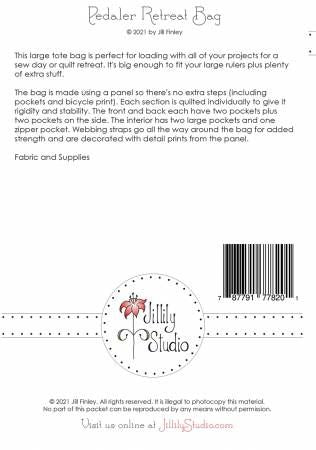 From Jillily Studio By Finley, Jill In Bags, Purses, Totes & Electronic Covers Finished Size: 18in x 25in x 8in This large tote bag is perfect for loading with all of your projects for a sew day or quilt retreat. It's big enough to fit your large rulers plus plenty of extra stuff. The bag is made using a panel so there's no extra steps (including pockets and bicycle print). Each section is quilted individually to give it rigidity and stability. The front and back each have two pockets plus 2 pockets on the side. The interior has two large pockets and one zipper pocket. Webbing straps go all the way around the bag for added strength and are decorated with detail prints from the panel. Printed Paper Pattern Final Product: Tote Bag Templates Sold Separately Finished Size: 18in x 25in x 8in Technique: Standard Sewing Machine Skill Level: Intermediate