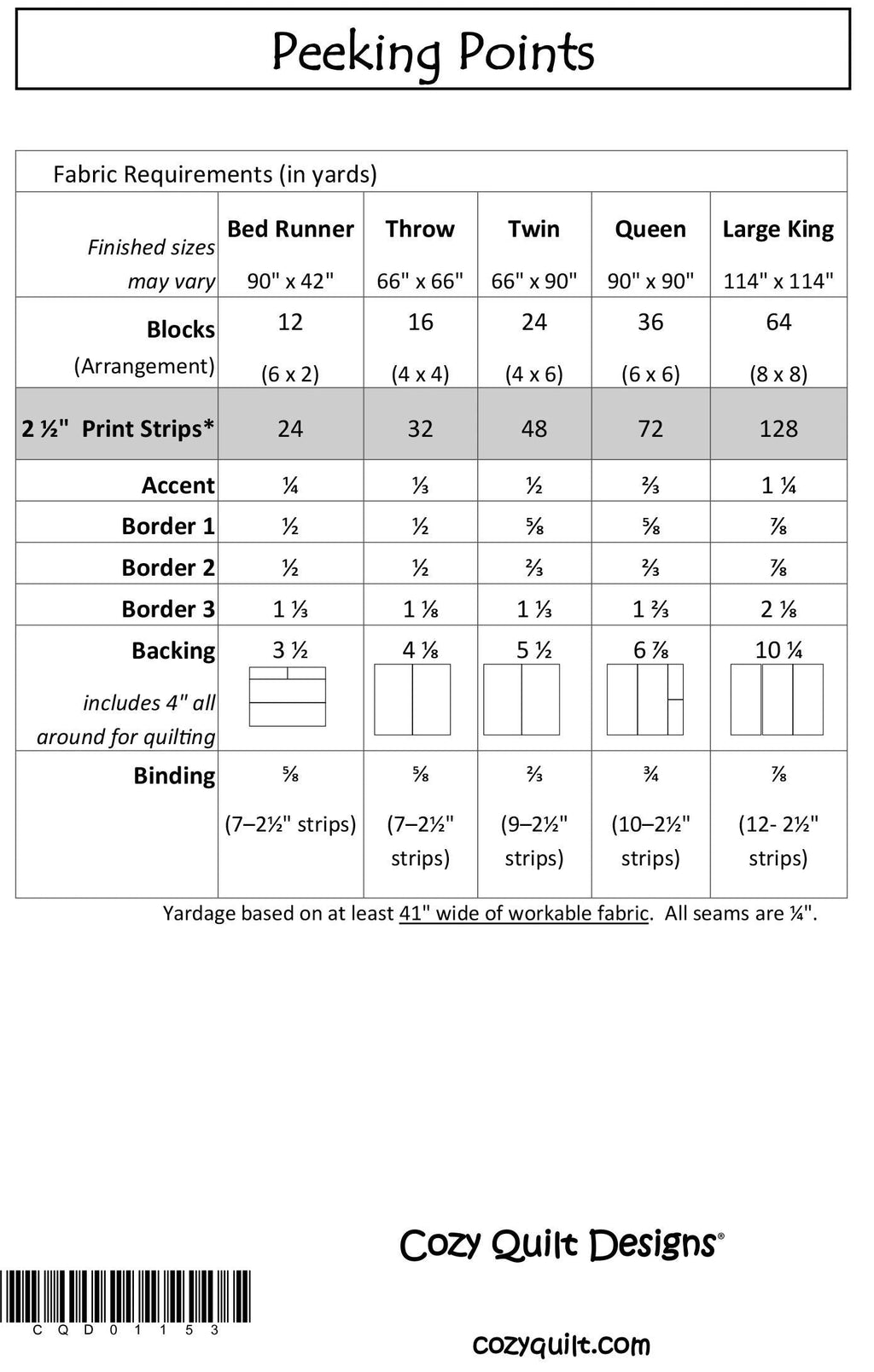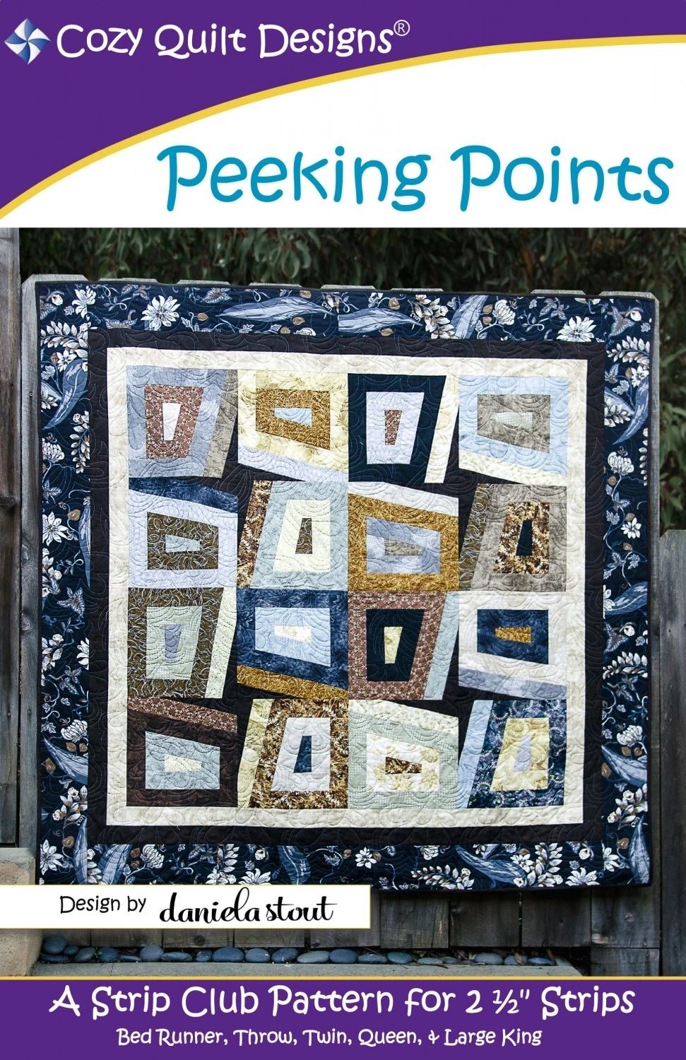 From Cozy Quilt Designs In Quilts A Cozy Strip Club Pattern Designed for 2½"" Strips This pattern is easy and familiar. And the results? Funky and fresh! Peeking Points uses log cabin techniques to make a wacky combination of angled squares and a star in the secondary design. The pattern includes instructions for: • Bed Runner • Throw • Twin • Queen • King • Large King