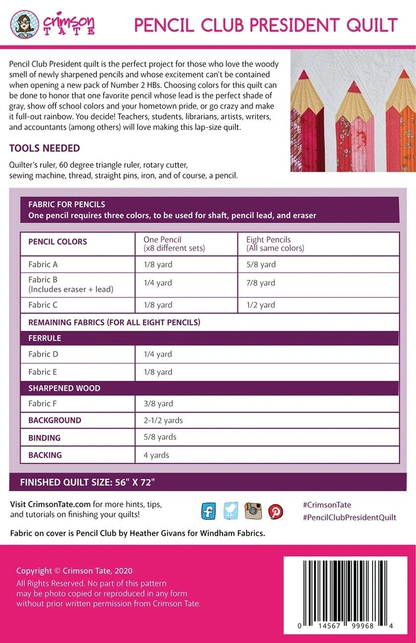 From Crimson Tate By Givans, Heather In Quilts Pencil Club President quilt is the perfect project for those who love the woody smell of newly sharpened pencils and whose excitement can't be contained when opening a new pack of Number 2 HBs. Choosing colors for this quilt can be done to honor that one favorite pencil whose lead is the perfect shade of gray, show off school colors and your hometown pride, or go crazy and make it full-out rainbow. You decide! Teachers, students, librarians, artists, writers, and accountants (among others) will love making this lap-size quilt. Fabric showcased on cover is called Pencil Club by Heather Givans for Windham Fabrics.
