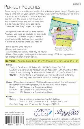 From Lazy Girl Designs - Joan Hawley By Hawley, Joan In Bags, Purses, Totes & Electronic Covers These handy little pouches are perfect for all kinds of great things. Whether you need a little bag for your sewing supplies, to use with your luggage or to throw in your purse or backpack, there is a perfect size for you. The inside is lined. Use any standard zipper and find out how easy it is to put a zipper in using Lazy Girl’s trademark ‘Sew Easy’ zipper installation technique. This pieced pattern is also a ‘Fat Quarter Cutie’, which means these pouches can be made from fat quarter cuts of fabric. Finished sizes approx: Small – 5? x 7? Medium – 7? x 10? Large – 9? x 13?