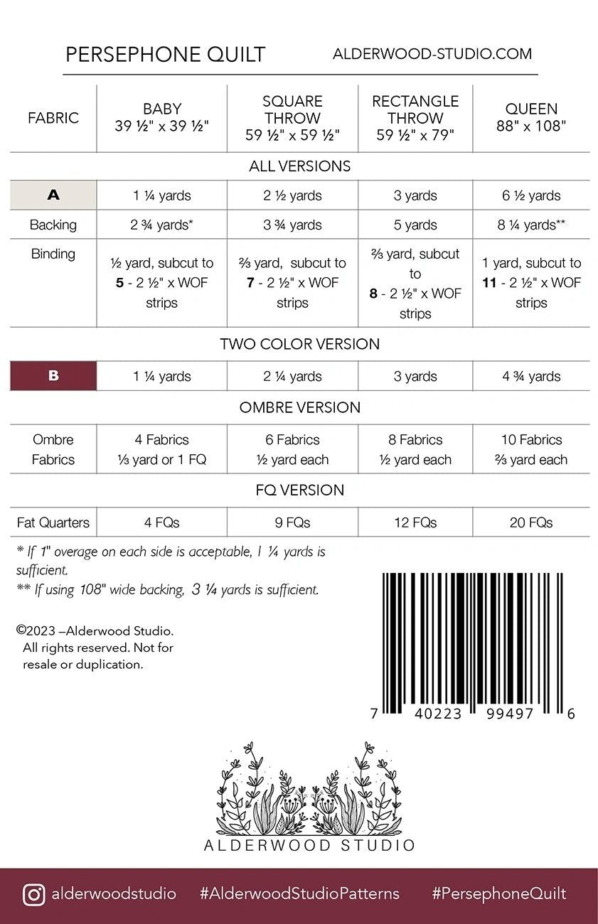 The Persephone quilt pattern was inspired by the Greek myth of Persephone, goddess of the spring and rebirth, and by the new growth that emerges from the ground every spring. This pattern is rated as intermediate, but could likely be completed by an advanced beginner as well. This pattern comes in a baby, square throw, rectangle throw, or bed size. It can be made in a two color, ombre, or fat quarter version. Printed Paper Pattern Finished Size: Multiple Final Product: Quilt Technique Used: Standard Machine Sewing Skill Level: Intermediate