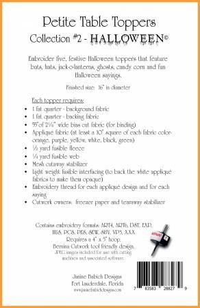 From Janine Babich Designs By Babich, Janine In Placemats, Table Runners & Toppers Embroider five festive Halloween toppers that feature bats, hats, jack-o-lanterns, ghosts and candy corn applique designs and fun Halloween sayings.File formats: ART4, ART6, DST, EXP, HUS, PCS, PES, SEW, SHV, VP3 and XXX. Includes JPEG images for use with cutting machines. Finished size: 16in in diameter. Digital Download Code Finished Size: 16in Diameter Final Product: Home Decor Technique Used: Applique/Machine Embroidery Skill Level: Beginner
