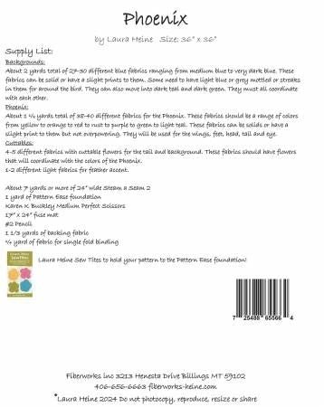 From Fiberworks Inc By Heine, Laura In Quilts Phoenix Collage Pattern by Laura Heine. This stunning Phoenix represents rebirth and a renewed life. Have you overcome a major setback? If so, you're a lot like the Phoenix yourself! After learning through its cycles of fire and ash, in time becomes an angel of pure energy , eternally bright. Pattern includes colorful step by step instructions to complete this quilt for your home. Finished size 36x36. Printed Paper Pattern Finished Size: 36in x 36in Final Product: Wall Hanging Paper Templates Included Technique Used: Standard Machine Sewing Skill Level: Intermediate