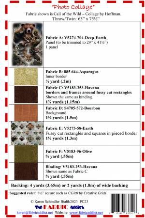 From Fabric Addict By Schindler, Karen In Quilts Photo Collage quilt pattern. Easy to make. Uses a 29" vertical panel. Suggested ruler is an 8½” square. Featured fabric is Call of the Wild - Collage by Hoffman. Printed Paper Pattern Finished Size: 63in x 75-1/2in Final Product: Quilt Technique Used: Standard Machine Sewing Skill Level: Confident Beginner