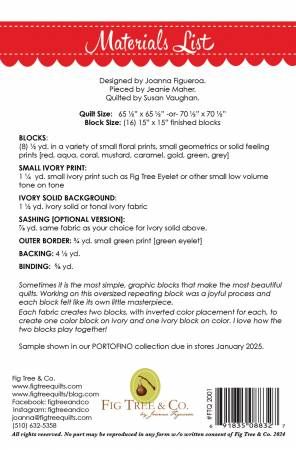 From Fig Tree Quilts By Figueroa, Joanna In Quilts Sometimes it is the most simple, graphic blocks that make the most beautiful quilts. Working on this oversized repeating block was a joyful process and each block felt like its own little masterpiece. Each fabric creates two blocks, with inverted color placement, to create one color block on ivory and one ivory block on color. I love how the two blocks interplay with one another! Printed Paper Pattern Finished Size: 65 1/2" x 65 1/2" -or- 70 1/2" x 70 1/2" Final Product: Quilt Technique Used: Standard Machine Sewing Skill Level Confident Beginner