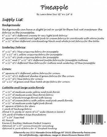 From Fiberworks Inc By Heine, Laura In Quilts Pineapple Collage Pattern by Laura Heine. With it's regil crown of spiny blue green leaves and the sweet tropical pineapple hanging in your home just might give you a sweet tooth. This collage of cuttable flowers that makes this quilt vibrant and happy. This pattern includes colored photos and step by step instructions to complete this quilt. Finished size 18"x24". You can either bind it or put it on a stretch canvas. Printed Paper Pattern Finished Size: 18in x 24in Final Product: Wall Hanging Paper Templates Included Technique Used: Standard Machine Sewing Skill Level: Confident Beginner