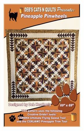 From Deb's Cats N Quilts By Heatherly, Deb In Quilts The Pineapple Pinwheels pattern has directions for a lap size 67in x 67in as well as a king size 108in x 108in. It uses the CGRDH4 Ultimate Flying Geese Tool and introduces a new technique for the CGRJAW3 Pineapple Trim Tool which creates a variation that looks like pinwheels.