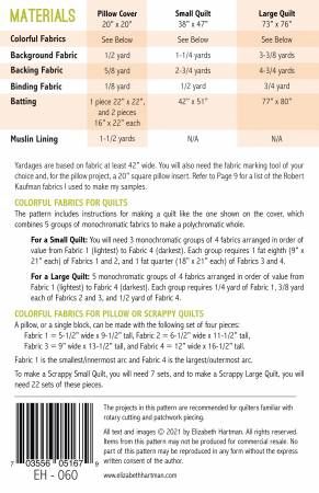 From Elizabeth Hartman By Hartman, Elizabeth In Quilts Polychromatic includes instructions for making patchwork rainbow quilts in two sizes, plus a pillow. Everything is made using conventional patchwork techniques. No templates or paper piecing! Each block includes a smaller number of larger pieces than most of my other patterns, making this a relaxing project perfect for turning your favorite colors and fabrics in cheerful rainbow blocks.