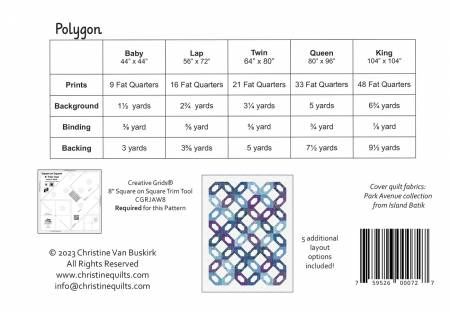 This Fat Quarter friendly quilt is made from a single block, but has so many possible variations! Use the Creative Grids 8" Square on Square tool to make the block, then choose one of the 6 layout options to design your quilt. Five sizes included: Baby: 44" x 44", Lap: 56" x 72", Twin: 64" x 80", Queen: 80: x 96", King: 104: x 104". Printed Paper Pattern Finished Size: Multiple Final Product: Quilt Template Sold Separately (CGRJAW8) Technique Used: Standard Machine Sewing Skill Level: Confident Beginner