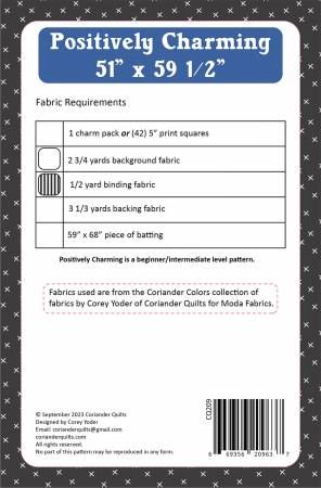 From Coriander Quilts By Yoder, Corey In Quilts Charm pack friendly quilt designed by Corey Yoder finishing at 51" x 59 1/2" featuring Coriander Colors fabric by Corey Yoder of Coriander Quilts for Moda Fabrics. Printed Paper Pattern Finished Size: 51in x 59-1/2in Final Product: Quilt Technique Used: Standard Machine Sewing Skill Level: Confident Beginner