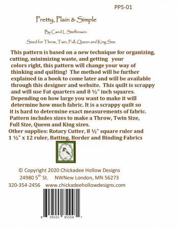 From Chickadee Hollow Designs By Steffensen, Carol In Quilts This Pattern is based on a new technique of organizing,cutting,minimizing waste, and getting your colors right, this pattern will change your way of thinking and quilting! This quilt is scrappy and will use Fat Quarters and 8 1/2" squares