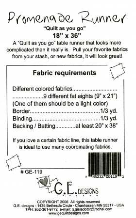 From G. E. Designs By Erla, Gudrun In Placemats, Table Runners & Toppers This table runner looks much more complicated than it really is. It is 18” x 36” and uses 9 different “Fat Eights”. Just dig into your stash or pick a fabric line to use those beautiful coordinating fabrics.