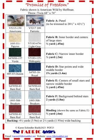 From Fabric Addict In Quilts Promise of Freedom quilt pattern. Throw/Twin size. Quilt of Valor size. Easy to make. Uses horizontal panel (29" x 43" approx). Printed Paper Pattern Finished Size: 68in x 74in Final Product: Quilt Technique Used: Standard Machine Sewing Skill Level: Confident Beginner