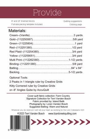 From Lizard Creek Quilting By Vanden Bosch, Terri WRAPUPSALE_2024 Collection In Quilts Provide is an 80" x 80" farm country based quilt. When my husband and I started farming--a good corn yield would be 150 bushels an acre. 35 years later, we had areas in one of our fields that registered 300 bushels an acre on the GPS computer in our combine. We have managed the fertility of our soil through many sources--one of them being Precision GPS application of the seed, fertilizers and manure from our animals to very precise levels of exactly the amount each square inch of land requires. Being a good steward of this land is what my husbands' family farm is very committed to so that we can continue to Provide to others around the world. Pattern includes detailed cutting and piecing instructions, coloring page and quilting suggestions. Printed Paper Pattern Finished Size: 80in x 80in Final Product: Quilt Technique Used: Standard Machine Sewing Skill Level: Confident Beginner