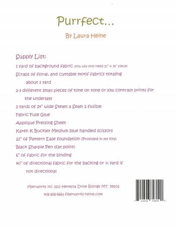 From Fiberworks Inc By Heine, Laura In Quilts Purrfect cat collage pattern by Laura Heine includes full sized pattern and step by step color instruction to complete the quilt. Great beginner collage pattern. Fused applique. Size 21 x 35.