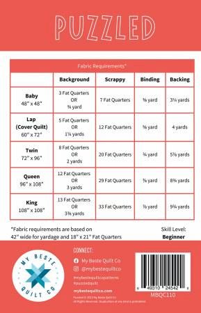 From My Beste Quilt Co By Den Beste, Renee In Quilts Puzzled is a pre-cut friendly, scrappy pattern using fat quarters. This pattern is perfect for beginners. The pattern has instructions for baby (48" x 48"), Lap (60" x 72"), Twin (72" x 96"), Queen (96" x 108") and King (108" x 108"). Scrap Friendly Fat Quarter Friendly Printed Paper Pattern Finished Size: Multiple Finished Product: Quilt Technique Used: Standard Machine Sewing Skill Level: Beginner