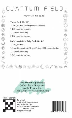 From Irish Chain By Irish, Sandi In Quilts Quantum Field comes in a throw size quilt (55 x 58") and a little lap or baby size (34 x 41"). Shades of blue give it a wintry look, or try reds, greens and golds for the Holidays. 1930's reproductions give it a classic look and the little lap is the perfect size for sitting in your favorite chair. This pattern is part of the Quilted Jewel Series and REQUIRES the Quilted Jewel Templates available from the Irish Chain. Printed Paper Pattern Finished Size: 55in x 58in Final Product: Quilt Technique Used: Standard Machine Sewing Skill Level: Confident Beginner