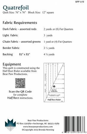 Quatrefoil is a stunning design that gives the impression of curves when only straight seams are sewn. The quilt is fat quarter friendly. This pattern is designed to use BPP HRR Half Rect Ruler to create half rectangle units. A paper template is printed in the pattern, but the ruler makes trimming so much easier. Full color instructions. Printed Paper Pattern Finished size: 76in x 76in. Final Product: Quilt Paper Templates Included Technique Used: Standard Machine Sewing Skill Level: Confident Beginner