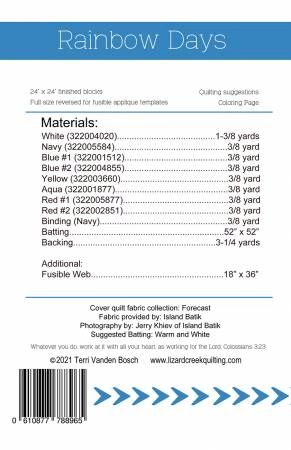 From Lizard Creek Quilting By Vanden Bosch, Terri WRAPUPSALE_2024 Collection In Quilts Rainbow Days is a quick and easy 48" x 48" project to cheer your days. It would make a fun playmat or nursery decor. Change up the colors to fit your liking. "When it rains look for rainbows, when it's dark look for stars" --Oscar Wilde Remember that springtime and harvest are always promised to us. Island Batik fabrics used for cover quilt. Patterns include detailed cutting and piecing directions. Full size templates reversed for fusible applique. Coloring page and quilting suggestions. Printed Paper Pattern Finished Size: 48in x 48in Final Product: Quilt Paper Templates Included Technique Used: Applique / Standard Machine Sewing Skill Level: Confident Beginner