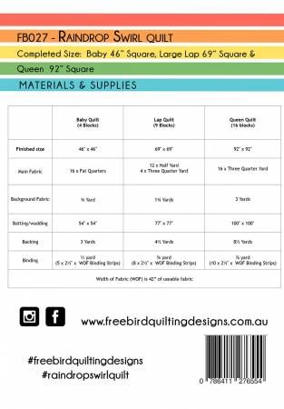 From Free Bird Quilting Designs In Quilts If you are a quilter who is new to curves and would like a big curve to practice on and the bonus is, it’s a repeat block. If this sounds like you or you love sewing curves and want a quick quilt, then this is the quilt for you. The beauty of this quilt is the pattern is written for chain piecing, which means the quilt comes together very quickly and easily. The pattern has all the instructions for a baby quilt, large lap quilt and queen quilt. It can be made using your favourite range of fabrics or fabrics from your stash. There are lots of diagrams for cutting, assembly and ironing your blocks plus a colouring in page to help you choose your colour way. Printed Paper Pattern Finished Size: 46in x 46in & 69in x 69in Final Product: Quilt Paper Templates Included Recommends FB027T Template Set Technique Used: Standard Machine Sewing Skill Level: Confident Beginner