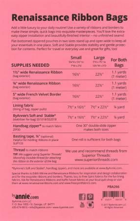 From ByAnnie By Unrein, Annie In Bags, Purses, Totes & Electronic Covers Add a little luxury to your daily routine! Use a variety of ribbons and borders to make these simple, quick bags into exquisite masterpieces. Renaissance Ribbon Bags are perfect for travel or everyday use and great for gifts, too! You’ll love the extra-easy zipper installation and beautifully-finished interior no unfinished seams! The flat-bottomed zippered pouches in two sizes stand up and open wide to keep all your essentials in one place. Soft and Stable provides stability and gentle protection for contents. The small bag measures 5-3/4in H x 5-1/2in to 7in W x 2in D and the large bag measures 5in H x 7-1/2in to 10-1/2in W x 3in D. The exterior of the bags are made using ribbons and velvet border. We recommend and used ribbons and borders from Renaissance Ribbons. Renaissance Ribbons exquisite woven jacquard ribbons and their beautiful Velvet Borders are packaged in 1 meter (approx. 39in) pieces. With careful cutting, a 1-meter piece of each 1-1/2in, 3/8in , and 5in ribbon/border will make one small and one large bag. Each bag uses just one side of a piece of zipper tape, so one 30in double-slide zipper will make both bags! Add-on Video notice: There is an Add-on Video available for this pattern. The Add-on Video™ is specially designed to support specific parts of the pattern and help the customer learn our best techniques. It doesn't replace pattern it will enhance their sewing experience. To support local quilt shops, every paper pattern includes a coupon for the value of the Add-on Video. This is a $5.00 value. Customers can then use the coupon to get the video for free on our website. Uses Soft and Stable: PBASS1018, PBASS2018 Zipper: ZIP30 + color