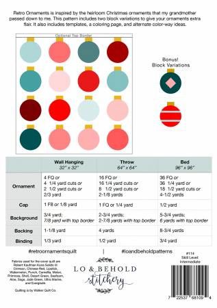 From Lo & Behold Stitchery In Quilts Retro Ornaments is inspired by the heirloom Christmas ornaments that my grandmother passed down to me. This pattern is fat quarter friendly and comes in three sizes. It's the perfect way to display your favorite prints or solids! This pattern also includes two bonus block variations to give your ornaments extra flair. Templates, a coloring page, and color-way ideas come with the pattern as well.