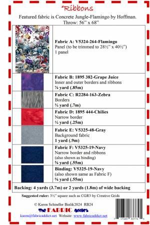 From Fabric Addict By Schindler, Karen In Quilts Ribbons quilt pattern. Throw size. Uses vertical panel (trimmed to 28 1/2" x 40 1/2"). Ribbons are easily pieced with half-square triangles. Printed Paper Pattern Finished Size: 56in x 68in Final Product: Quilt Technique Used: Standard Machine Sewing Skill Level: Confident Beginner