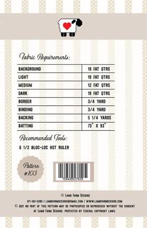 From Lamb Farm Designs By Lamb, Jennie Jo WRAPUPSALE_2024 Collection In Quilts 2 different machine pieced blocks combine to make an interesting cross-hatch design. Excellent stash buster quilt and fat quarter friendly and fat eighth friendly. Great for a beginner. Directions step by step with great graphics and all pressing directions included. Printed Paper Pattern Finished Size: 67in x 85in Final Product: Quilt Technique Used: Standard Machine Sewing Skill Level: Confident Beginner