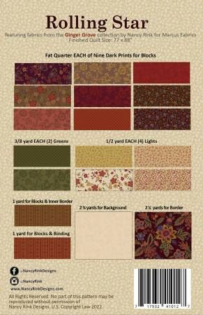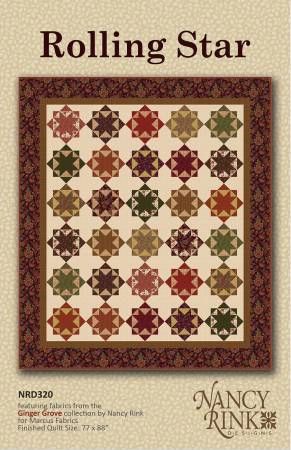 From Nancy Rink Designs By Rink, Nancy In Quilts Who doesn't love repeating star-type blocks in a variety of fall colors? And it's made with several fat quarters and framed with a lush floral. The quilt shown was made with Nancy Rink's Ginger Grove fabric collection by Marcus Fabrics. Printed Paper Pattern Finished Size: 77in x 88in Final Product: Quilt Technique Used: Standard Machine Sewing Skill Level: Confident Beginner