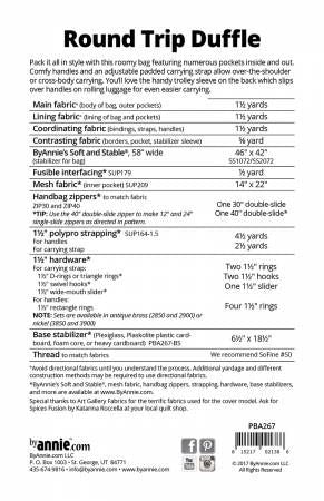 From ByAnnie By Unrein, Annie In Bags, Purses, Totes & Electronic Covers Pack it all in style with this roomy bag! Round Trip Duffle is sturdy enough for all your adventures and a bag that you will enjoy for years to come. The exterior of the bag features a handy combination slip and zippered pocket on front as well as slip pockets on each side and on the back. The main compartment opens with a double-slide zipper which extends part-way down each side, allowing easy access to the roomy interior. Inside are a full zippered mesh pocket and three fabric slip pockets. Comfy side handles and an adjustable padded carrying strap allow over-the-shoulder or cross-body carrying. You’ll love the handy trolley sleeve on the back which slips over handles on rolling luggage for even easier carrying. The finished bag measures 12in H x 19-1/2in W x 7-1/2in D. Add-on Video notice: There is an Add-on Video available for this pattern. The Add-on Video is specially designed to support specific parts of the pattern and help the customer learn our best techniques. It doesn't replace pattern it will enhance their sewing experience. To support local quilt shops, every paper pattern includes a coupon for the value of the Add-on Video. This is a $5.00 value. Customers can then use the coupon to get the video for free on their website. Round Trip Duffle is appropriate for all levels of sewists, even confident beginners. The clear and complete pattern instructions combined with the helpful Add-On Video Tutorial will guide them through the entire process. Uses By Annie's items Soft and Stable:PBASS1072,PBASS2072 Mesh:SUP209-XXX Vinyl:SUP15115YD Zippers:ZIP30-XXX,ZIP40-XXX Strapping:SUP164-1.5B-6YD,SUP164-1.5W-6YD,SUP164-1.5B-50YD,SUP164-1.5W-50YD Hardware:HAR1.5AB2850,HAR1.5AB2900,HAR1.5N3850,HAR1.5N3900