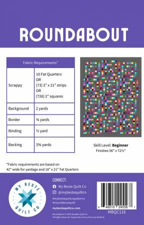 From My Beste Quilt Co By Den Beste, Renee In Quilts Roundabout is a pre-cut friendly, scrappy pattern using fat quarters. This quilt involves strip piecing so it goes together quickly. Great to use as a scrappy sew along. This pattern is perfect for beginners and finishes 56" x 72½". Scrap Friendly Fat Quarter Friendly Printed Paper Pattern Finished Size: 56" x 72½" Finished Product: Quilt Technique Used: Standard Machine Sewing Skill Level: Beginner