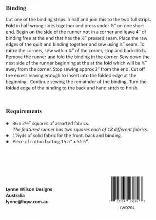 From Lynne Wilson Designs By Wilson, Lynne In Placemats, Table Runners & Toppers Decorate your table in style with this machine pieced and big stitch quilted table runner. Gather together your scraps, choose a background and off you sew. Finish your runner with easy to do big stitch quilting. Voila, done!!!