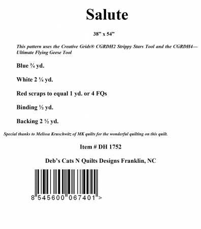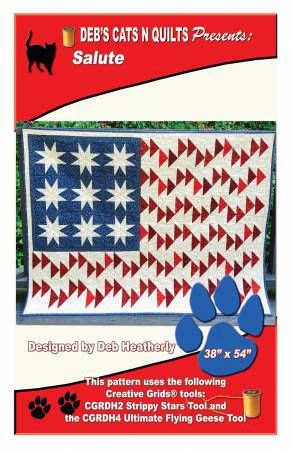 From Deb's Cats N Quilts By Heatherly, Deb In Quilts Salute is a patriotic quilt with flying geese and stars. This pattern uses Creative Grids CGRDH2 Strippy Stars Tool and CGRDH4 Ultimate Flying Geese Tool. Finished size: 38in x 54in.