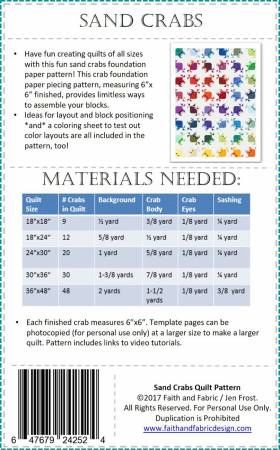 From Faith and Fabric By Frost, Jen In Quilts SEASON: Summer / Anytime Have fun creating quilts of all sizes with this fun sand crabs pattern! This adorable foundation paper pieced pattern comes with photo instructions and a video tutorial on how to piece these adorable crabs. Fabric requirements provided for quilts of varying sizes, ideas for layout and block positioning, and a coloring sheet to test out color layouts are all included in the pattern!