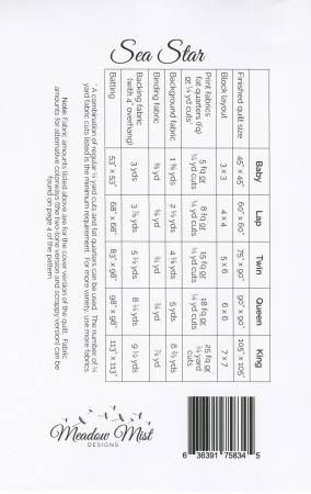 From Meadow Mist Designs By Brickey, Cheryl In Quilts Sea Star is a fat quarter friendly pattern that combines plus signs and star designs. The pattern is written in at a confident beginner level and contains a coloring sheet to audition possible color schemes and fabrics. Sea Star includes instructions for five sizes: baby, lap, and twin, queen, and king.
