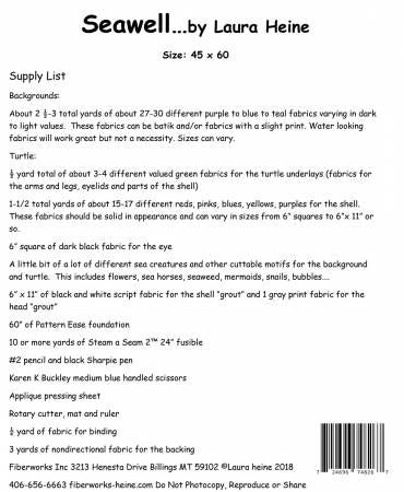 From Fiberworks Inc By Heine, Laura In Quilts Seawell the Sea Turtle Collage Pattern by Laura Heine. Full size pattern and complete color instruction included. Size 45in x 60in