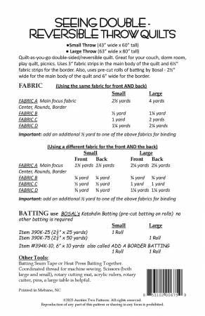 From Aunties Two By McLeod, Carol In Quilts Fun quilt-as-you-go reversible throw quilts. Both front and back are pieced and quilted as you go! Quilt starts with a medallion center, then uses 3” fabric strips and 2 ½” strips of batting to complete the bulk of the quilt. Add a border with Bosal’s new Add A Border pre-cut quilt batting 6” wide by 10 yards long. Pattern includes directions for 2 sizes 43”x 60” and 63” x 80” Uses Bosal’s pre-cut Katahdin Batting on a Roll; Small uses 1 roll of 390K-25; Large uses 1 roll 390K-75 Each size also uses Bosal’s new pre-cut Katahdin Add-A-Border Batting on a roll 6” x 10 yards 394K-10