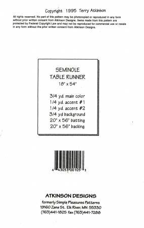From Atkinson Designs By Atkinson, Terry In Placemats, Table Runners & Toppers Table Runner: 18in x 54in. So quick & easy you can't stop with just one! Uses a theme print & two coordinating prints, and a background fabric.