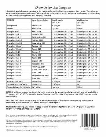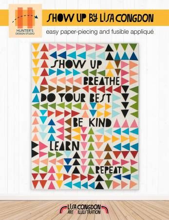 From Hunter's Design Studio By Hunter, Sam In Quilts Show Up is a collaboration between artist Lisa Congdon and quilt pattern designer Sam Hunter. The quilt uses easy paper-piecing and fusible applique techniques to impart its inspirational message. Instructions for two sizes (lap/snuggle and wall-hanging) included.