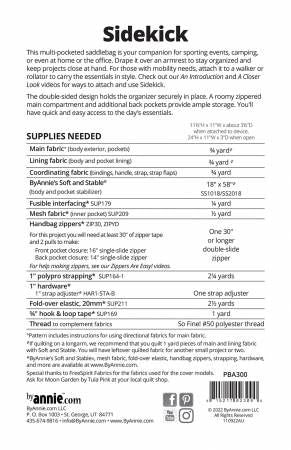 From ByAnnie By Unrein, Annie In Bags, Purses, Totes & Electronic Covers This multi-pocketed saddlebag is your companion for sporting events, camping, or even at home or the office. Drape it over an armrest to stay organized and keep projects close at hand. For those with mobility needs, attach it to a walker or rollator to carry the essentials in style. The double-sided design holds the organizer securely in place. A roomy zippered main compartment and additional back pockets provide ample storage. You'll have quick and easy access to the day's essentials. Be sure to check out our An Introduction and A Closer Look videos for ways to attach and use Sidekick. Printed Paper Pattern Finished size: 11-1/2in H x 11in W x about 3-1/2in D when attached to device Final Product: Purse / Tote / Bag Technique Used: Standard Machine Sewing Skill Level: Beginner CLASS INFO: Sidekick makes a great class for all levels of sewists and something that everyone from soccer moms to grandma will enjoy making and using. We'd suggest two half-day classes for this project. In the first class, they can complete steps II through VII of the pattern, prepare the various components of the organizer. What isn't finished during class can be assigned as homework to finish before the next class. In the second class, they'll complete step IX and X to prepare the Body Front and assemble the organizer. We recommend that students read the pattern and watch the Add-on Videos before coming to class. To make best use of class time, we also recommend that they come to class with everything cut out and labeled for their project and that they complete the basic steps to cut and quilt the fabrics for the project. So, they should complete all of step I. Cut and Quilt on pages 2 and 3 BEFORE coming to class. Add-on Video notice: There is an Add-on Video™ available for this pattern. The Add-on Video™ is specially designed to support specific parts of the pattern and help the customer learn our best techniques. It doesn't replace the pattern -- it will enhance their sewing experience.