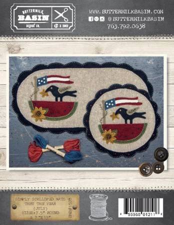 From Buttermilk Basin By West, Stacy In Wool Mr. Crow is ready to enjoy the summer and show his patriotic spirit! The pattern includes 2 wool applique mats, the round one is 7.5" round and the oval is 7" x 15" and is perfect to display a candle on or use as a mug rug!
