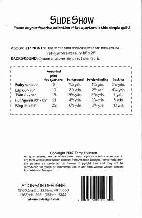 Focus on your favorite collection of fabric in this fat quarter quilt. Baby - 54in x 66in, lap - 66in x 78in, twin - 78in x 90in, full/queen - 90in x 102in, king - 114in x 114in.