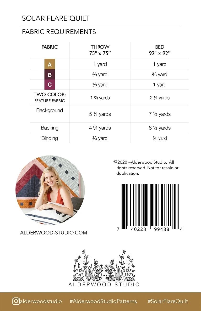 Solar Flare is a strikingly unique intermediate level quilt that uses strip piecing to create its signature flare blocks. It has been our best selling pattern since it's release, and can be made in either a two color or multicolor version. Available in a large throw size (75” x 75”) or a bed size (92” x 92”). Printed Paper Pattern Finished Size: Multiple Final Product: Quilt Technique Used: Standard Machine Sewing Skill Level: Intermediate