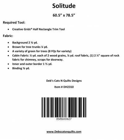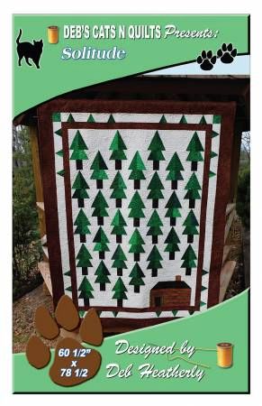 From Deb's Cats N Quilts By Heatherly, Deb In Quilts Grab your green scraps, or a package of green 10" squares, and make this fun 60 1/2" x 78 1/2" quilt using the Creative Grids Half Rectangle Trim Tool CGRDH6. This quilt would look great in a mountain cabin, or make a great gift for anyone who likes the outdoors. And, while the trees shown on the cover are green, imagine an autumn theme. Let your imagination soar. Printed Paper Pattern Finished Size: 60-1/2in x 78-1/2in Final Product: Quilt Technique Used: Standard Machine Sewing Skill Level: Confident Beginner