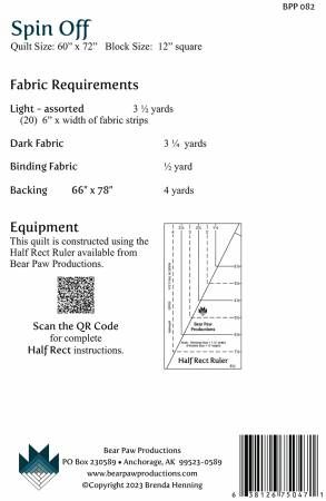 Spin Off is a simple design of half rectangle and half square triangle units. The traditional placement of background and dark fabrics is reversed creating a soft contrast. This pattern is designed to use BPP HRR Half Rect Ruler to create half rectangle units. A paper template is printed in the pattern, but the ruler makes trimming so much easier. Full color instructions. Printed Paper Pattern Finished size: 60in x 72in. Final Product: Quilt Paper Templates Included Technique Used: Standard Machine Sewing Skill Level: Confident Beginner