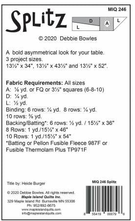 From Maple Island Quilts By Bowles, Debbie WRAPUPSALE_2024 Collection In Placemats, Table Runners & Toppers A bold asymmetrical look for your table. 3 project sizes. 13in; x 34in, 13 ½in x 43 ½in, and 13 ½in x 52in. Great fun for quick seasonal project. Good for classe