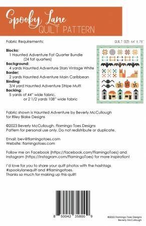 From Flamingo Toes By McCullough, Beverly In Quilts Get ready to head down Spooky Lane with this fun Halloween Row Quilt! This sweet Halloween Quilt is filled with fun Halloween elements including bats, cats, and houses. This quilt is fat quarter friendly and there will be a sew along that begins in June 2023. Quilt Size: 64” x 78“ Fabric Requirements Blocks: 1 Haunted Adventure Fat Quarter Bundle (24 fat quarters) Background: 4 yards Haunted Adventure Stars Vintage White Border: 2 yards Haunted Adventure Main Caribbean Binding: 3/4 yard Haunted Adventure Stripe Multi Backing: 5 yards of 44” wide fabric, or 2 1/2 yards 108” wide fabric Printed Paper Pattern Finished Size: 64in x 78in Final Product: Quilt Technique Used: Standard Machine Sewing Skill Level: Confident Beginner
