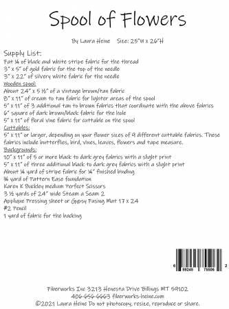 From Fiberworks Inc By Heine, Laura In Quilts Spool of Flowers Collage Pattern by Laura Heine. This is a MUST have for your sewing room. With black backgrounds, antique looking material for your spool and beautiful flowers on the thread. This pattern includes colored photos and step by step instructions to complete this quilt. Finished size 25x26. Printed Paper Pattern Final Product: Wall Hanging Finished Size: 25in x 26in Technique: Standard Machine Sewing Templates included: Yes - Paper Templates Skill Level: Beginner