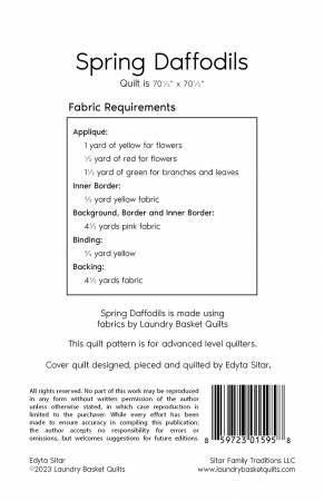From Laundry Basket Quilts By Sitar, Edyta In Quilts Spring Daffodils is a stunning pieced appliqué quilt that is made using fabrics by Laundry Basket Quilts for Andover. Quilt is for advanced level quilters. Finished quilt size is 70½" x 70½". Printed Paper Pattern Finished Size: 70-1/2in x 70-1/2in Final Product: Quilt Paper Templates Included Technique Used: Standard Machine Sewing Skill Level: Advanced