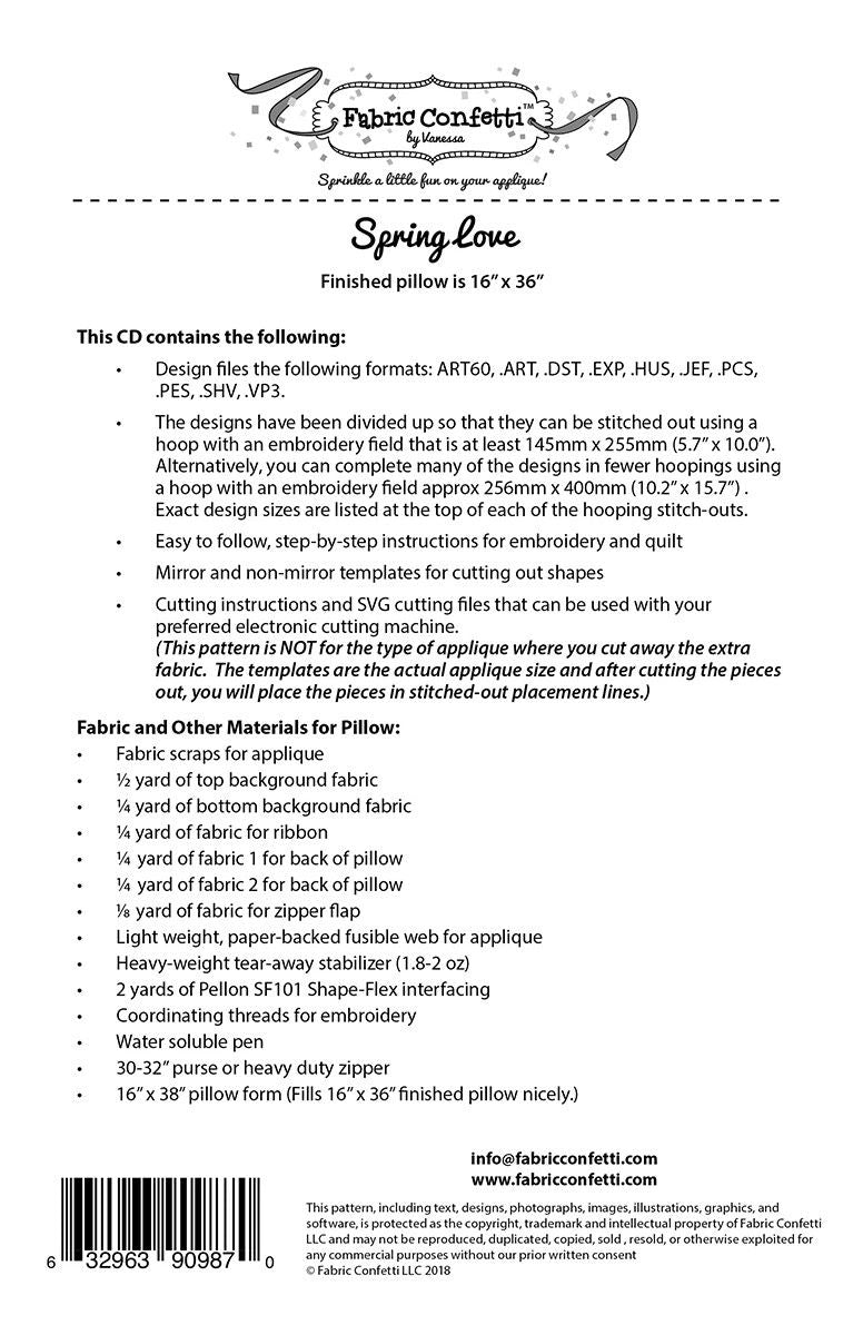 From Fabric Confetti By Fromm, Vanessa In Pillows and Rugs The Spring Love Bench Pillow pattern includes design files and step-by step instructions. Machine embroidery designs come in the following formats: ART60, .ART, .DST, .EXP, .HUS, .JEF, .PCS, .PES, .VP3. A hoop with an embroidery field at least 145mm x 255mm (5.7” x 10”) is required. PDF and SVG cutting files included. Finished pillow is 16in x 36in.